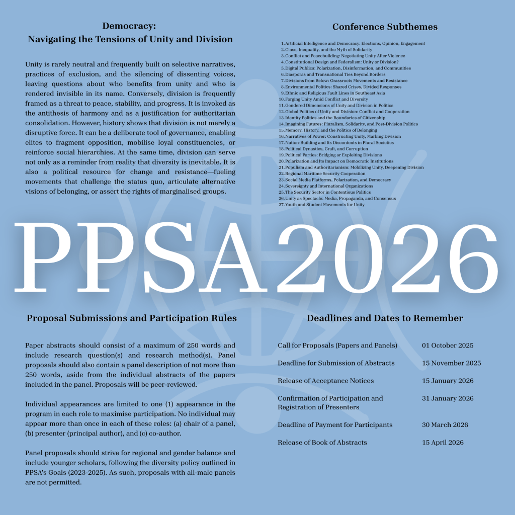 The conference seeks to offer a wide range of opportunities for scientific inquiry and critical analysis in the fields of Philippine politics, political theory, comparative politics, international relations, and research methodology. The 2026 International Conference of PPSA aims to convene presentations that explore both the unity and division within Philippine politics and the discipline of political science.